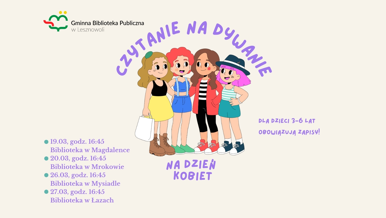 Serdecznie zapraszamy dzieci w wieku 3–6 lat na marcowe spotkania z książką w ramach cyklu „Czytanie na dywanie”. Z okazji miesiąca kobiet w każdej z bibliotek przeczytamy fragmenty książki „Opowieści na dobranoc dla młodych buntowniczek”. Podczas zajęć dzieci wysłuchają fragmentu książki, porozmawiają o ważnych