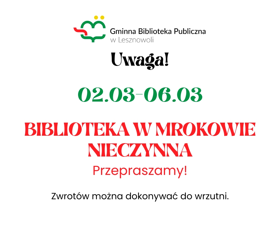 Uwaga! Od poniedziałku 2 marca do piątku 6 marca biblioteka w Mrokowie będzie nieczynna. Przepraszamy za utrudnienia. Zwrotów można dokonywać do wrzutni.