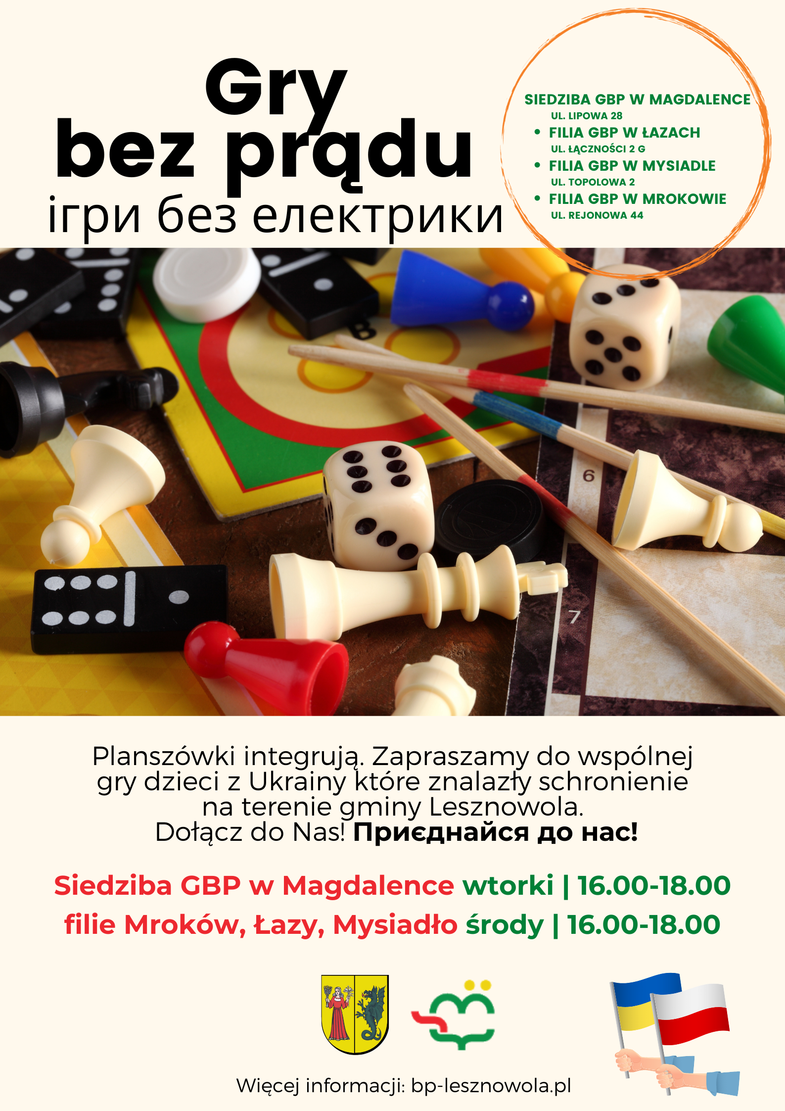 Biblioteki na terenie gminy Lesznowola zapewniają bezpłatny dostęp do Internetu, możliwość skorzystania z komputera, skaner, xero i drukarkę oraz możliwość naładowania telefonu. Raz w tygodniu organizujemy w każdej filii „Gry bez prądu” czyli spotkania integracyjne dla dzieci. Zapraszamy we wtorki 16.00-18.00 do Magdalenki oraz w środy w godz. 16.00-18.00 do pozostałych naszych filii. Dzieci wiedzą, że trwa wojna, ale potrzebują wsparcia, zabawy i możliwości oderwania się od całego tego zła. 4 marca odbyło się spotkanie on-line pt. „Wojna, jak rozmawiać o niej z dziećmi i młodzieżą”, na którym terapeutka, założycielka Inspiratorni Rodzica pani Anna Czuba odpowiadała na pytania naszych czytelników. GBP w Lesznowoli przystąpiła do akcji zorganizowanej przez serwis Lustro Biblioteki pt. „Serce dla Ukrainy”, w naszych oknach pojawiły się charakterystyczne serca w kolorach flagi Ukrainy.