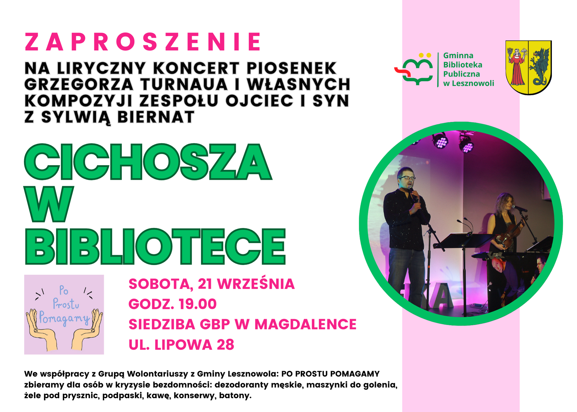 My też połączyliśmy przyjemne z pożytecznym. Zgodnie z pomysłem Agaty Kacprzak Kołakowskiej, która zgłosiła pomysł na ten koncert do naszego konkursu inicjatyw oddolnych podczas wydarzenia odbyła się także zbiórka materiałów higienicznych. Agata jest liderką Grupy Wolontariuszy z Gminy Lesznowola, którzy działają pod nazwą Po prostu pomagamy . Zbieraliśmy dla osób w kryzysie bezdomności: dezodoranty męskie, maszynki do golenia, żele pod prysznic, kawę, konserwy, batony itp. Środki można w tygodniu donosić do biblioteki.