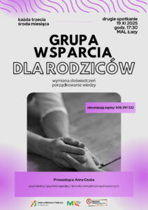 Zapraszamy rodziców, którzy brali wcześniej udział w warsztatach wychowawczych prowadzonych przez Annę Czubę, do udziału w grupie wsparcia dla rodziców – przestrzeni wymiany doświadczeń, refleksji i wzajemnego wzmocnienia.