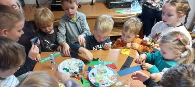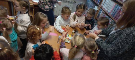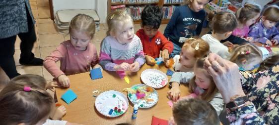 Dzieci zapoznały się z biblioteką, odpowiadały na zagadki bajkowe, wysłuchały opowiadania o Franklinie i zgubionej książce oraz zrobiły kolorowe zakładki.
