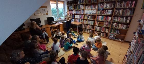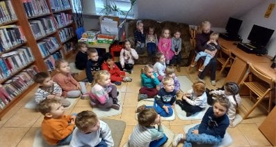 Dziś bibliotekę w Łazach odwiedziły dzieci z Przedszkola Niepublicznego Bzyczek, w zwiedzaniu biblioteki pomógł Wąż Bazyli.