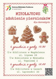 Gminna Biblioteka Publiczna w Lesznowoli zaprasza na świąteczne warsztaty Mikołajkowego zdobienia pierniczków. Podczas spotkania uczestnicy poznają proste i efektowne techniki dekorowania, tworząc własne, pięknie ozdobione świąteczne ciasteczka. Zajęcia odbędą się 6 grudnia w trzech filiach biblioteki.