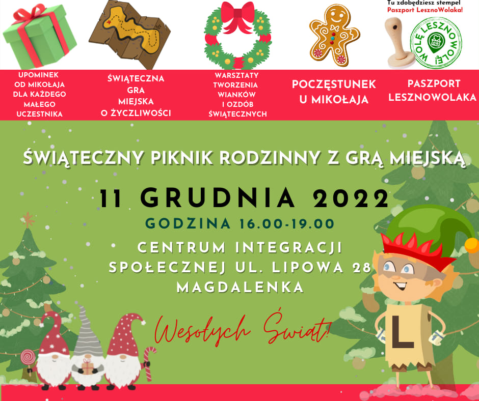W niedzielę 11 grudnia 2022 r. w godzinach 16:00-19:00 w Centrum Integracji Społecznej w Magdalence odbył się Piknik Mikołajkowy z Grą Miejską o życzliwości.