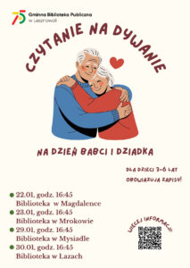 W tym miesiącu w każdej z bibliotek przeczytamy książki o dziadkach. W bibliotece w Magdalence oddamy się lekturze „Dzień, w którym babcia popsuła Internet” autorstwa Marc-Uwe Kling. W bibliotece w Mrokowie wsłuchamy się w historię „Superdziadek” napisaną przez Irenę Landau. W bibliotece w Mysiadle przeczytamy „Dzień Babci i Dziadka” z serii Przygody Fenka. Cykl spotkań zakończy się w bibliotece w Łazach, gdzie wsłuchamy się w „Basia i Dziadkowie” Zofii Staneckiej.