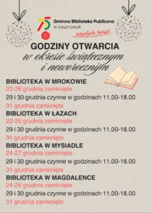 W okresie świątecznym i noworocznym nasze biblioteki będą działać w zmienionych godzinach. Zachęcamy, by zajrzeć na harmonogram poniżej.