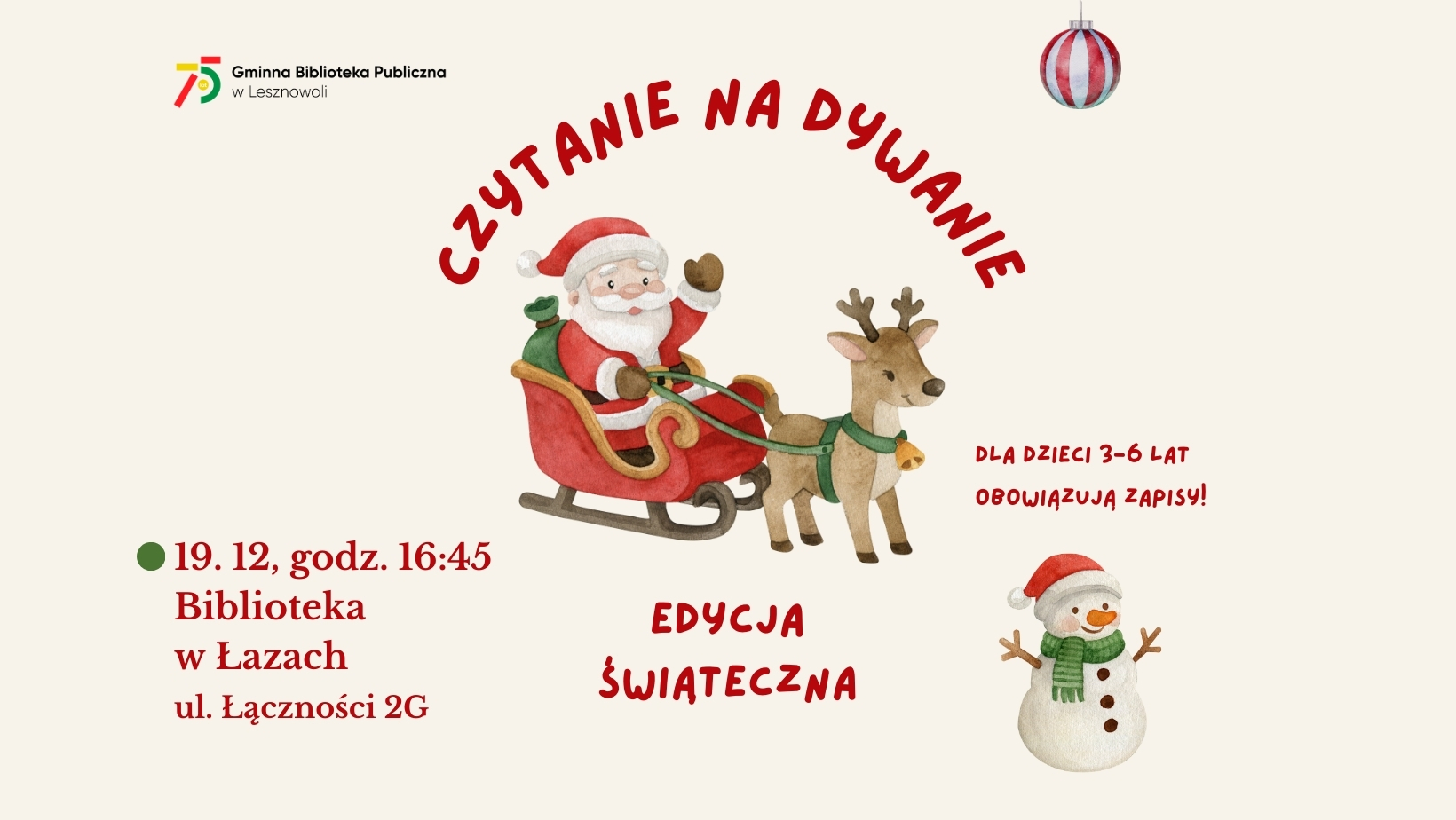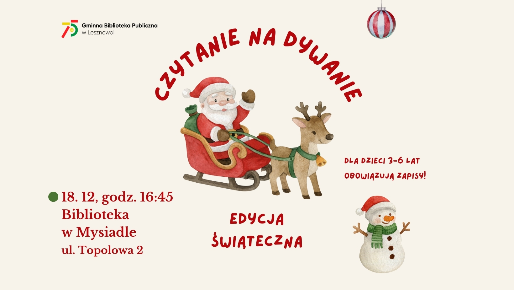 Biblioteka Mysiadło ul. Topolowa 2, MysiadłoSerdecznie zapraszamy dzieci w wieku 3–6 lat na grudniowe spotkania z książką w ramach cyklu „Czytanie na dywanie”.W tym miesiącu w każdej z bibliotek zostanie przeczytana inna książka. W bibliotece w Mysiadle przeczytamy „Paddington i świąteczna niespodzianka” Michaela Bonda. Podczas zajęć dzieci wysłuchają fragmentu książki, porozmawiają o Świętach Bożego Narodzenia i tradycjach, które obchodzą ze swoimi rodzinami, a także zaśpiewają jedną z kolęd. Zajęcia trwają ok. 45 minut. *Dziecko chętne do wzięcia udziału w wydarzeniu musi […]