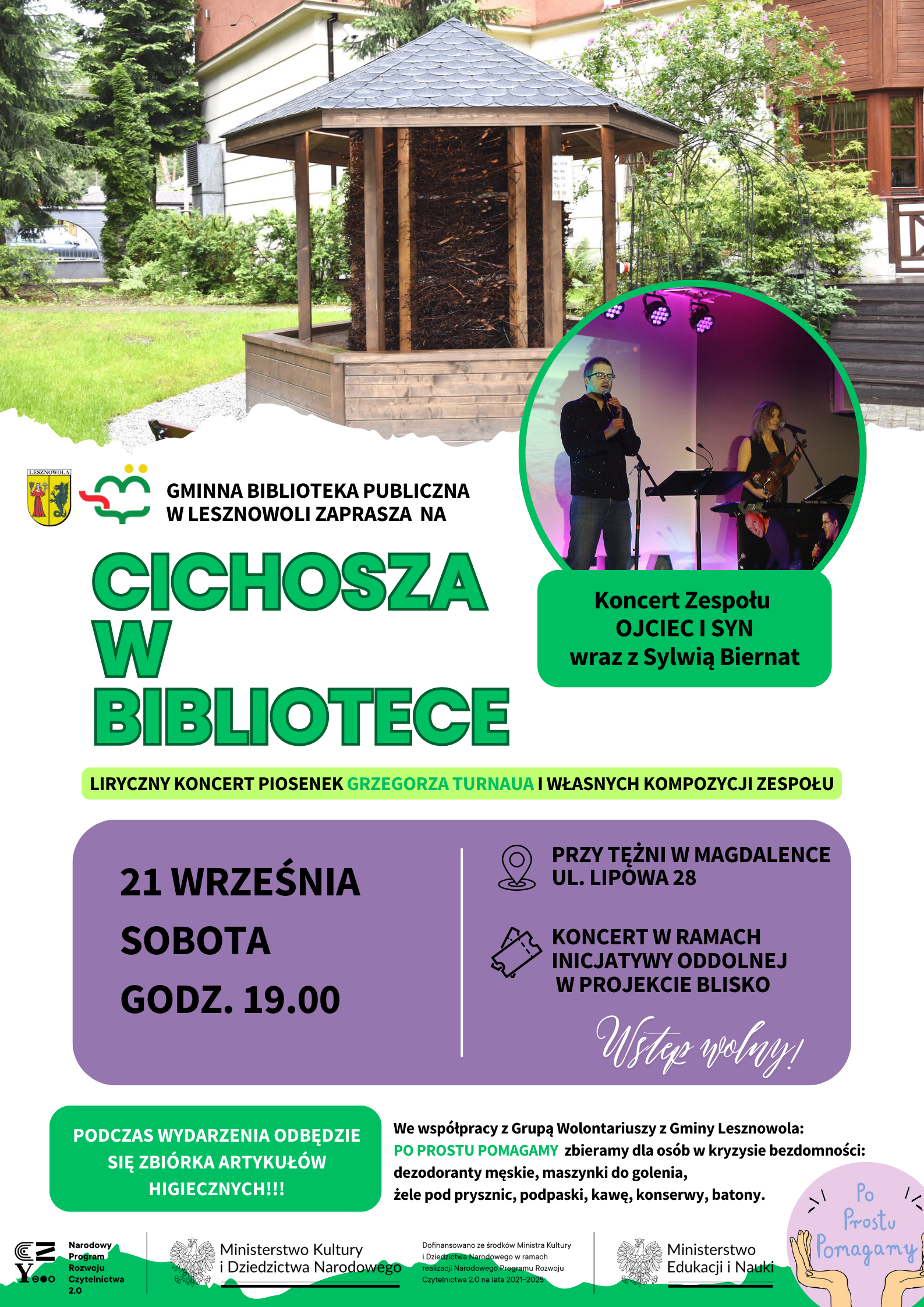 21.09.2024 r. zapraszamy na Koncert CICHOSZA W BIBLIOTECE połączony ze zbiórką artykułów higienicznych dla osób w kryzysie bezdomności
